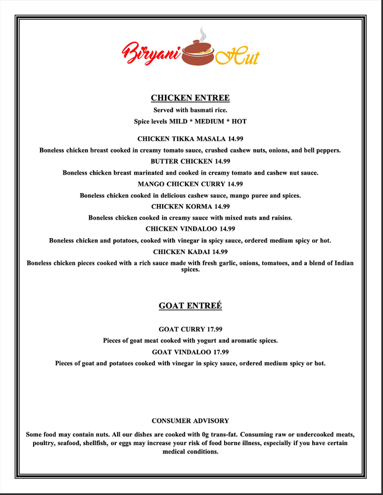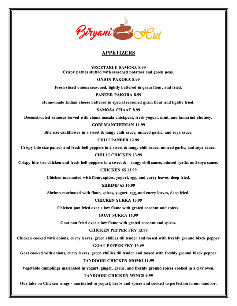 Patrons appreciate our friendly service and welcoming ambiance, making it a perfect spot for gatherings. Whether dining in or ordering for delivery, Biryani Hut promises a satisfying culinary experience. Join us and taste the passion and tradition in every bite!